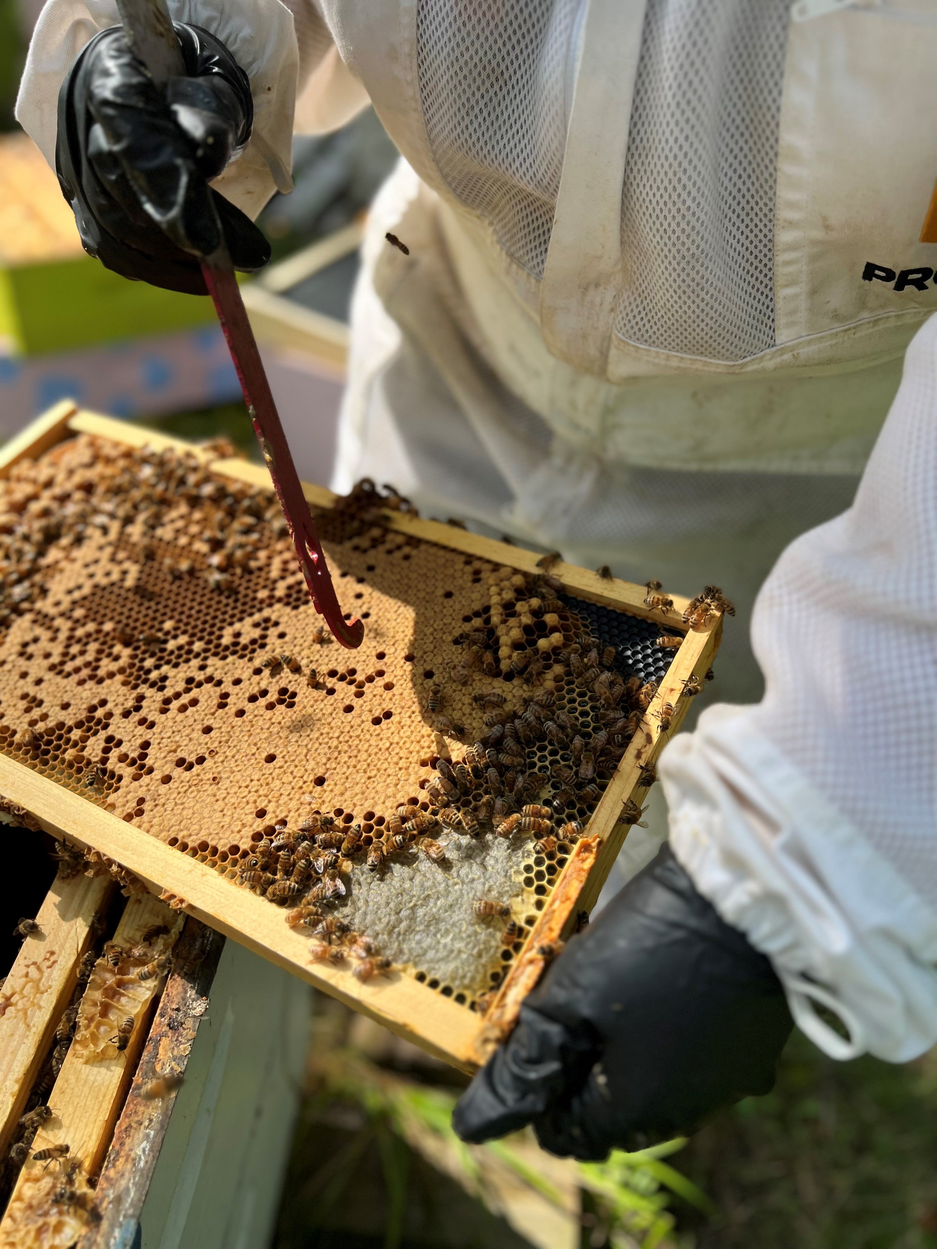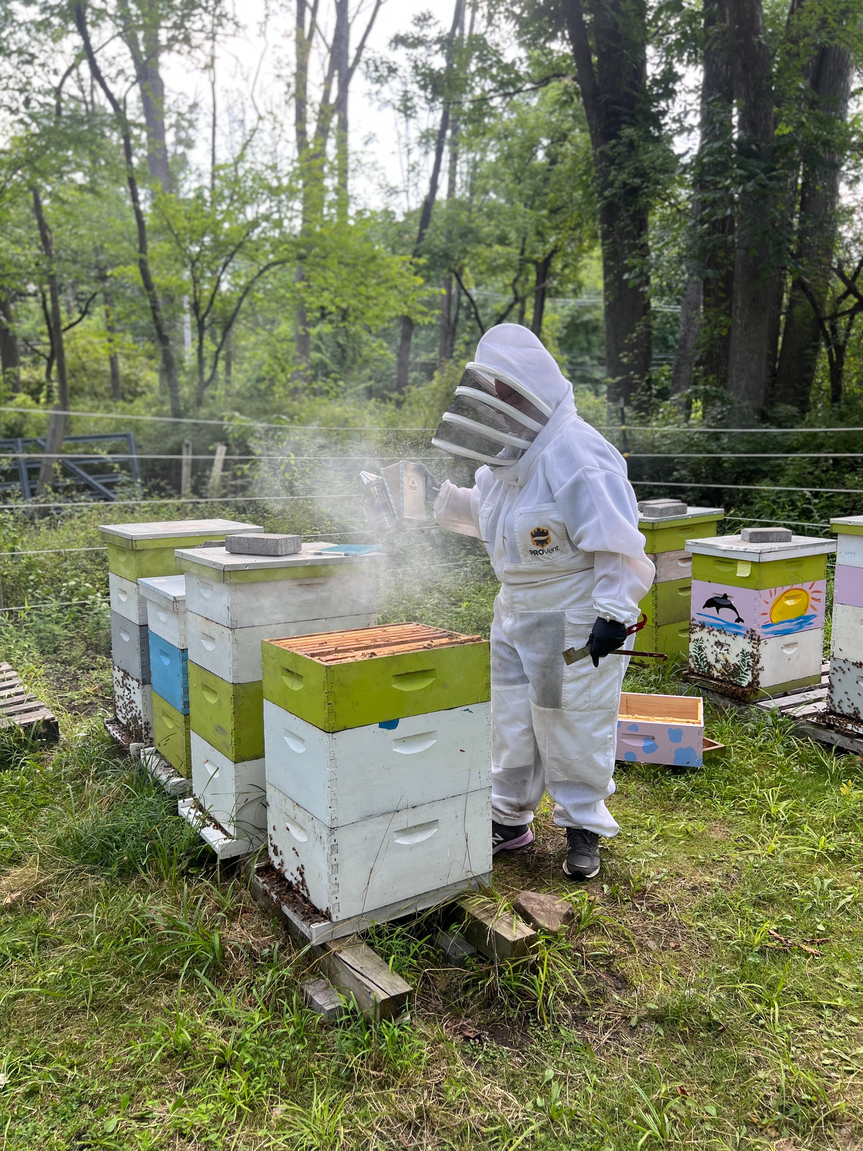 Donna digs into the hives by smoking the bees.